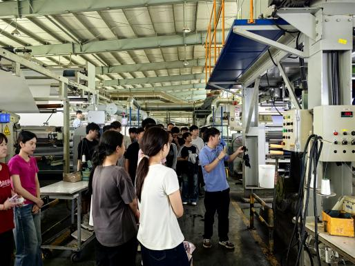 5月14日,纺织服装学院2023级染整技术专业师生赴行业龙头企业向兴集团开展实践教学活动。本次活动通过"生产现场教学+座谈交流"的形式,构建起"课堂-车间-会议室"三维一体的学习场景。