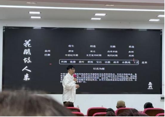刘老师以“宋元中国,海丝泉州”为主题,分享了如何将泉州的世界文化遗产——如泉州建筑线条、海洋文样、德化白瓷等元素,转化为25套极具视觉冲击力的高定时装。他坦言,策划过程中最大的挑战在于“让传统非遗对话当代审美”。讲座中,他清晰具体地讲解了深入调研、设计元素提取,通过解构传统纹样、创新材料应用,提升传统文化的时尚活化,最终在巴黎秀场上实现了“东方韵味与西方剪裁的完美平衡”,为师生们上了一堂精彩绝伦的时尚设计大课。