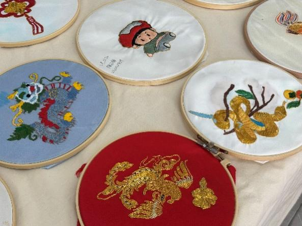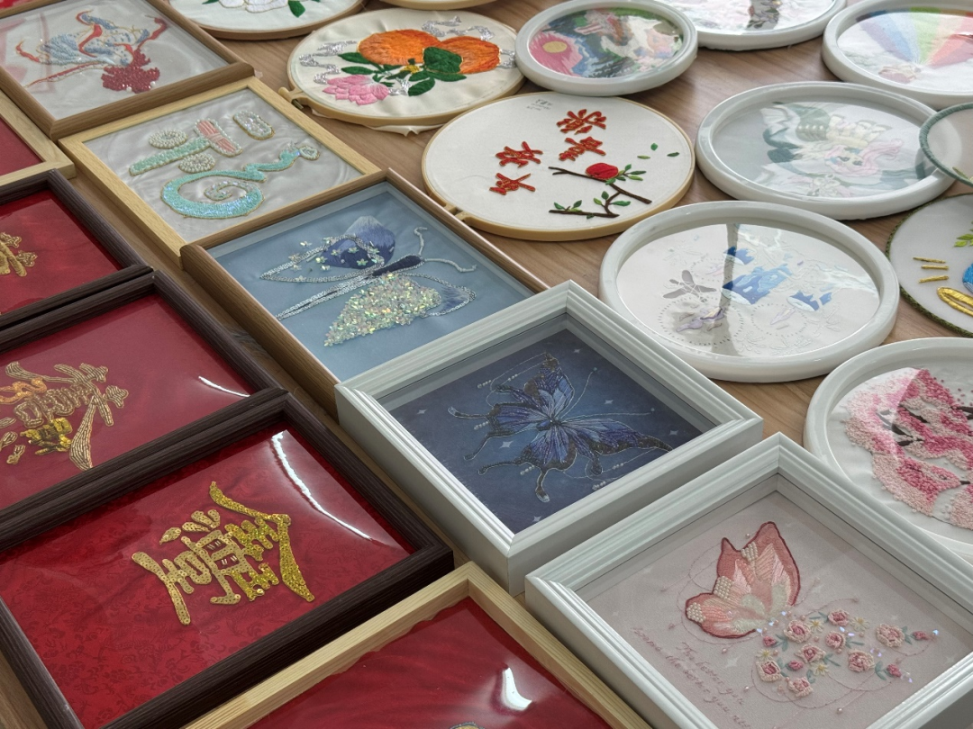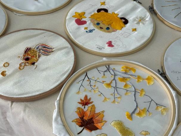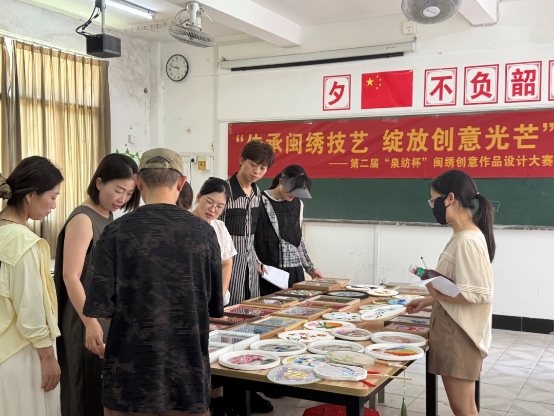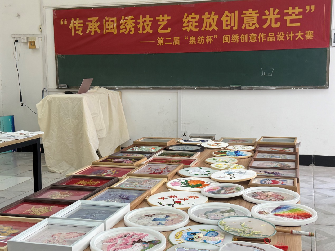近日,纺织服装学院在 2—405 教室成功举办了第二届“泉纺杯”闽绣创意作品设计大赛暨《闽绣技术运用》课程结课优秀作品展。此次活动从上午 9 点持续至下午 6 点,为师生们带来了一场传统与现代交织的视觉盛宴。