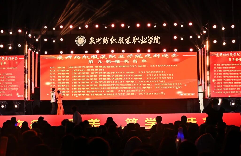 晚会期间穿插的三轮九次抽奖环节,为现场师生送上了定制精美礼品,一次次点燃全场热情,让欢声笑语萦绕校园。台前幕后的工作人员默默坚守,从灯光调试到流程衔接,每一处细节都彰显着泉纺人的匠心与担当。